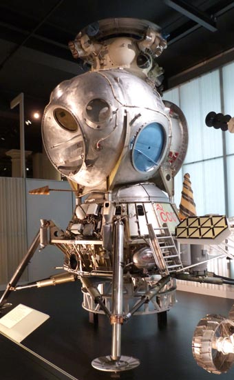 | The Russians had planned a moon landing and this is a life size model of their one-man moon lander | This space suit was used 13 times during space walks from the Mir space station | |