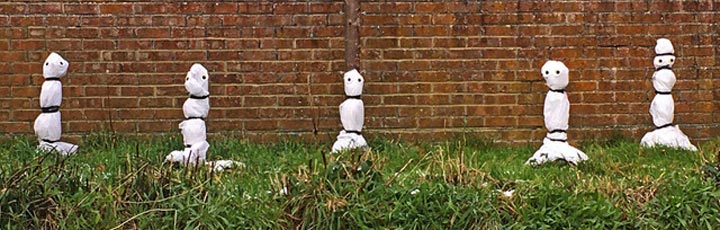 | Malcolm (he of the Heinkel bubble car) has a few banana trees growing in his garden and, wisely, wraps them up for the winter. Not content to leave them plain white, over a period of time has added to them. Photographs by Tricia - many thanks for your kind permission! |