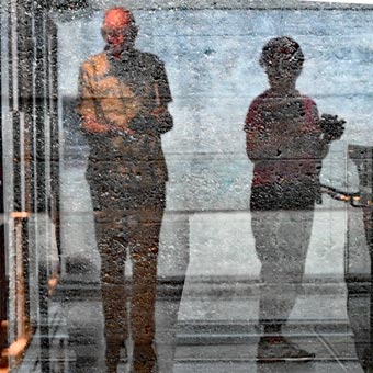 | A member of our party bravely agrees to blow a small bulb in a piece of very hot glass tubing | Who's that behind Liz - click to find out! | ||