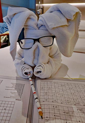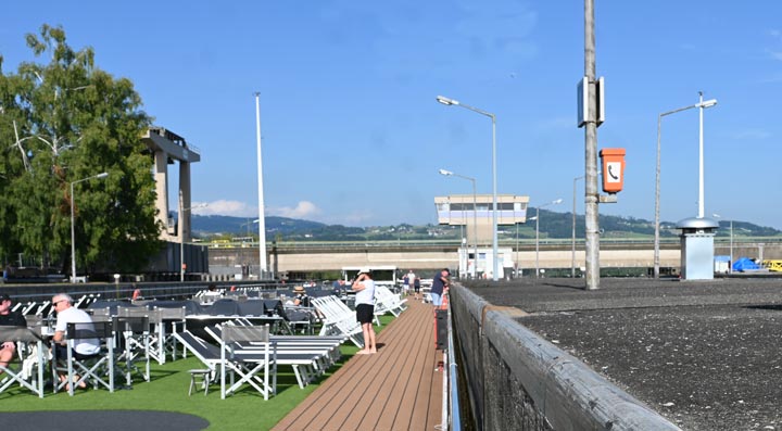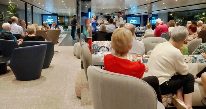 | The lounge - it was nice, after the multi decks of an ocean going ship, to only have three decks to deal with! Can you see Liz's reflection? |