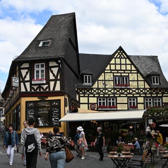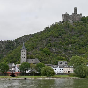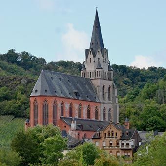 | The village of Wellmich and the imposing Maus Castle, which overlooks the Rhine River in the Upper Middle Rhine Valley, a UNESCO World Heritage site. | The Liebfrauenkirche (Church of Our Lady) in Oberwesel | ||