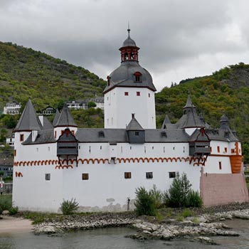 | The distinctive Pfalzgrafenstein Castle, a former toll castle situated on Falkenau island in the Rhine River near Kaub, Germany. | Rudesheim | ||