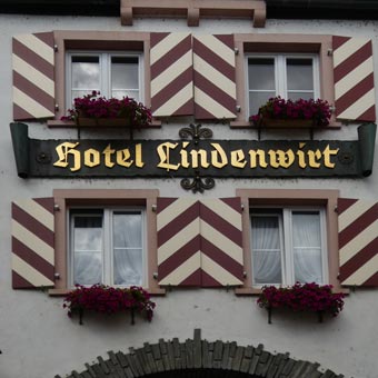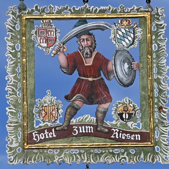 The Hotel zum Riesen (Hotel of the Giant) in Miltenberg. The hotel is considered one of Germany's oldest continuously operating inns, with its history dating back to at least 1411, and possibly as early as 1158. The David's Star on the sign has historical significance as a brewer's guild emblem - not primarily as a Jewish religious symbol |