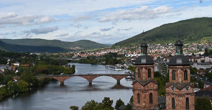 | A scenic view of the historic town of Miltenberg, situated on the Main River. The image taken from the Miltenberg castle, shows the town's distinctive red sandstone bridge and church towers, surrounded by forested hills. | |||