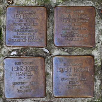 | Four Stolpersteine (stumbling stones), which are small, brass-plated concrete cubes embedded in the pavement as a memorial to victims of the Holocaust. Each stone commemorates an individual who lived at that location before being persecuted by the Nazis. More than 70,000 such stones have been laid across Europe. |