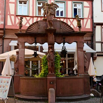 | The Engelsbrunnen (Angels' Well), a historic fountain located Wertheim. The fountain is made of red sandstone and dates back to 1574 and is named for the two angels perched on top, which bear the Wertheim coat of arms. |