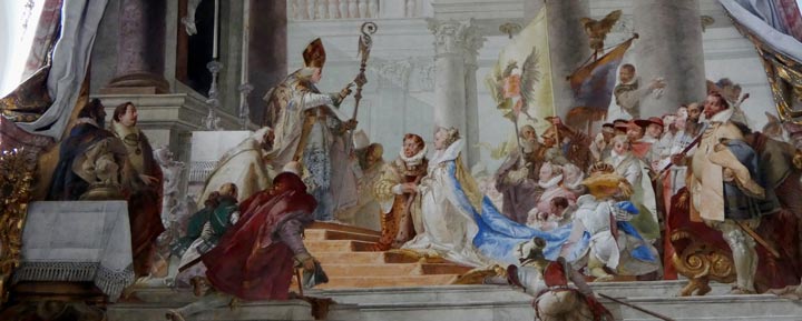 | The Emperor Frederick Barbarossa and his wife Beatrice kneel before Gebhard, Bishop of Würzburg. | |||