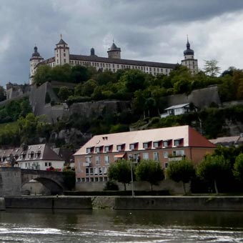 | The Mirror Cabinet in the Würzburg Residence, a stunning example of Rococo interior design. | The Alte Mainbrücke (Old Main Bridge) and the Marienberg Fortress in Würzburg | ||