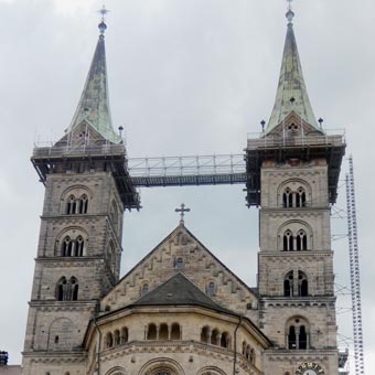 | The exterior of the Bamberg Cathedral in Bamberg, Germany, a significant historical and architectural landmark. The current structure is a late Romanesque building completed in the 13th century after earlier cathedrals burned down. It was founded by King (later Emperor) Heinrich II in 1002. The cathedral is part of the UNESCO World Heritage Site "Town of Bamberg". It is known for housing the only papal tomb in Germany (Pope Clement II) and the famous Bamberg Horseman statue. |