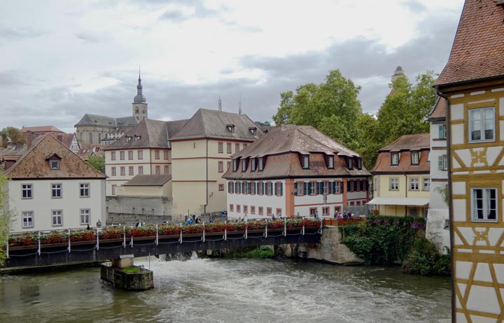 | The picturesque Bamberg Old Town showing buildings along the Regnitz River. This area is a UNESCO World Heritage site known for its medieval and baroque architecture. The scene features charming, half-timbered buildings situated precariously on a bridge over the rushing Regnitz River. The area is often referred to as "Little Venice" due to the row of old fisherman's houses. The prominent building with the spire in the background is the historic Bamberg Cathedral. The central building on the bridge is the iconic Altes Rathaus (Old Town Hall). | |||