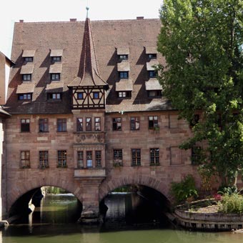 | The Heilig-Geist-Spital (Holy Spirit Hospital), a preserved medieval building located in the heart of Nuremberg's Old Town, Germany, built over the Pegnitz River. Built in the early 14th century, it was the largest hospital in the Free Imperial City of Nuremberg for centuries. The building is a charming example of medieval architecture. Its chapel served as the depository for the Imperial Regalia, the crown jewels of the Holy Roman Empire, from 1424 to 1796. Today the building serves as a retirement and nursing home |