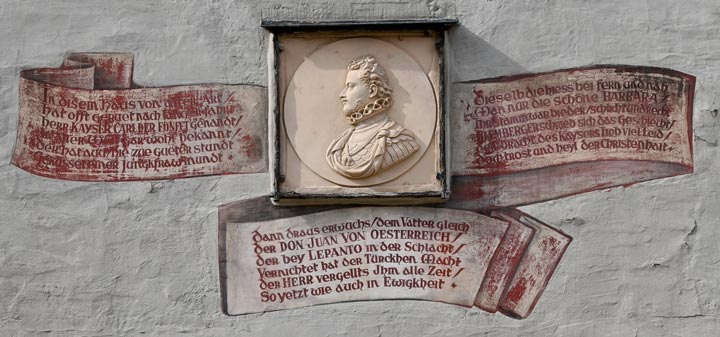 | An inscription painted on the facade of a building in Regensburg, known as the Kaiserherberge. The text commemorates Don Juan of Austria, the victor of the Battle of Lepanto. Translation Left Scroll: In this house of the Emperor Karl der Fünf (Charles V), was born Don Juan of Austria. Centre Scroll: Then grew up, like the father, Don Juan of Austria, who in the battle of Lepanto annihilated the Turks. May the Lord reward him for all time, now and in eternity. Right Scroll: Then the beautiful Barbara von Rimberg married into the family, a comfort and help to all Christians. |