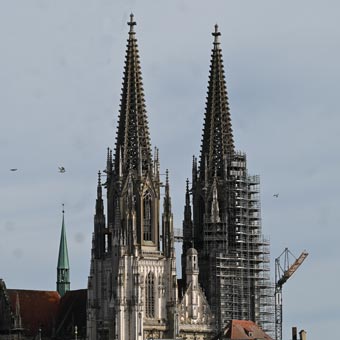 | Regensburg's Old Town, including the area pictured, is a UNESCO World Heritage site recognized as the "only authentically preserved large medieval city in Germany". Prominently featured are the spires of St. Peter's Cathedral, a significant example of French Gothic architecture that has towered over the city since the 13th century. The city has a rich history, founded by the Roman emperor Marcus Aurelius in 179 AD as "Castra Regina". Regensburg is known for its medieval architecture, including the famous Stone Bridge and the cathedral, with its spires reaching 110 meters in height. |