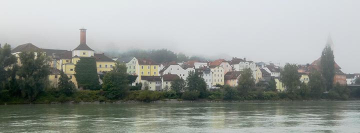| A view of the city of Passau as seen from across a river on a misty day. Passau is known as the "Three River City" because the Danube, Inn, and Ilz rivers all converge there. The buildings along the riverbank are characteristic of the city's architecture, which includes baroque elements, such as those found in the prominent St. Stephen's Cathedral. The city's location by three rivers has made it prone to severe flooding throughout its history. |