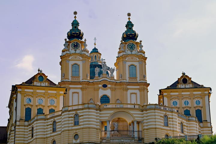 | Melk Abbey, a famous Benedictine monastery located in the town of Melk, Austria. This striking example of Baroque architecture sits on a rocky outcrop overlooking the Danube River. The abbey is characterized by its twin ornate towers, richly decorated façade, and a central dome rising above the church. | |||