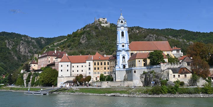 | The picturesque town of Dürnstein, located in the Wachau Valley along the Danube River in Austria. The most striking feature is the blue and white baroque tower of the Dürnstein Abbey, which stands prominently among the cluster of historic buildings with red-tiled roofs. Behind the town, green hills rise steeply, and at the top, the ruins of Dürnstein Castle are visible — a medieval fortress famous for once holding King Richard the Lionheart prisoner - see the statue and web site below. |