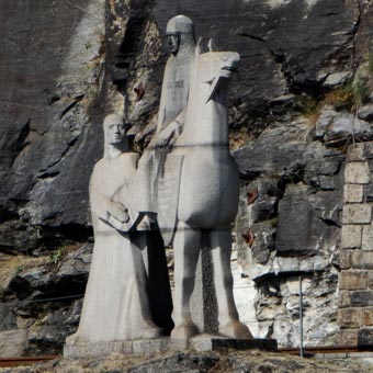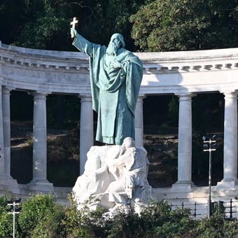 | The Statue of Saint Gellért (also known as the Gellért Monument) located on the side of Gellért Hill in Budapest, Hungary. The monument features a large bronze statue of Saint Gellért holding a cross, standing in front of a semi-circular colonnade. |