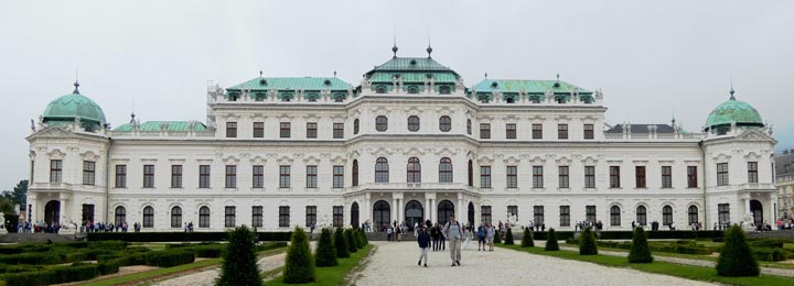 | Belvedere Palace in Vienna - a prime example of Baroque architecture. The building features a grand symmetrical façade with multiple windows, ornate decorations, and a central section topped by a green copper dome. Smaller domes are positioned at each corner of the structure, adding to its balanced design. | |||