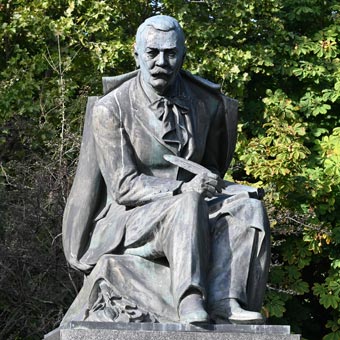 | A bronze statue of Pavol Országh Hviezdoslav, a prominent Slovak poet, dramatist, and translator. The sculpture depicts him seated, wearing formal attire with a long coat, and holding a book or papers in his lap, symbolising his literary contributions. Such statues are often found in public squares or parks in Slovakia, particularly in Bratislava, where Hviezdoslav is celebrated as one of the most important figures in Slovak literature. His works are known for their rich language and deep engagement with Slovak national identity. |