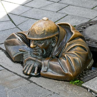 | Not everyone finds Cumil amusing! | Čumil – The “Man at Work” So, what’s the story behind this unusual man? Čumil is one of several whimsical statues that were installed in Bratislava’s Old Town in 1997. This was a few years after Slovak independence, at a time when the city was polishing its image and moving on from its grey, Communist past. The statues were a creative project to bring life and humour back to the historic streets. |