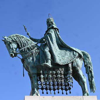 Sculpted by Stróbl Alajos, starting in 1898 and completing in 1903. This marked his first significant historical commission. The imposing figure of King Stephen, seated on a horse, reaches an impressive height, with the pedestal being 540 cm and the bronze figure an additional 400 cm. The king, donning a crown and draped in a cloak, holds a double cross in his right hand. | ||