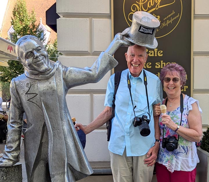 Liz and John with the statue of Schöner Náci (Handsome Ignatius), a beloved and eccentric figure from Bratislava, Slovakia, who lived in the first half of the 20th century. The statue (by Juraj Meliš) depicts a real person who was famous locally as a dandy. Ignác Lamár was nicknamed Schöne Náci, meaning ‘Handsome Ignatius’; he appears quite friendly and jolly on the statue, but one story records that his fiancée was deported to a Nazi concentration camp in World War II, where she died. He was born in Petržalka, (then Hungary) on 11 August 1897, and died of tuberculosis in Lehnice (then Czechoslovakia) on October 23, 1967 . He was originally buried in Lehnice, but his remains were reburied in Bratislava's Ondrejský cemetery on September 2, 2007 Schöner Náci was the son of a shoemaker and grandson of a famous clown, also Ignác Lamár, and was inspired by the latter's example to bring happiness to the streets of the city. He walked around the Old Town and in particular the stretch from Michael's Gate to the river, in top hat and tails, greeting women with the words, “I kiss your hand” in German, Hungarian and Slovak. He received free food from several of the city's cafes, and supported himself with occasional cleaning work He spent the last years of his life forgotten in a tuberculosis treatment facility in the village of Lehnice, where he died. Only in September 2007 were his remains transported from the local cemetery to the historic Ondrejský cemetery in the Bratislava centre near the graves of several prominent personalities of Slovakia. In the cemetery, as well as in the neighbouring Medic Garden, you can enjoy the greenery and tranquillity hidden in the very centre of the capital. Right - The man himself!