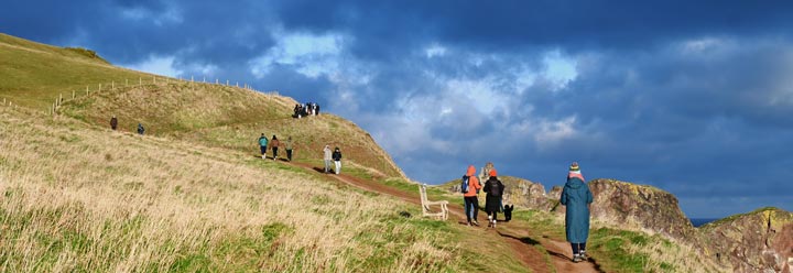 | Threatening clouds over Abbs Head - but it didn't rain. Liz in the foreground |